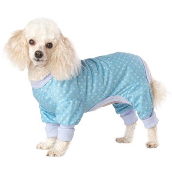 Pet Threads Jersey Blue Dot Pajamas for DogsYour dog is sure to have sweet dreams in these comfy jersey pj's. Great for relaxing, lounging and of course sleeping. Full coverage design is ideal for cold nights and the lightweight cotton jersey fabric makes it super comfortable. Pajamas have blue ribbed cuffs for extra comfort. Designed to be "user-friendly" for the pet owner, and pets can "do their business" without soiling the garments (they are cut up high enough in the tummy area). Pajamas are completely machine washable for easy cleaning.